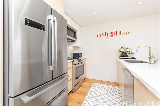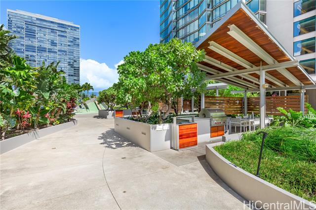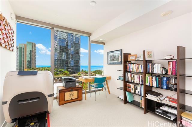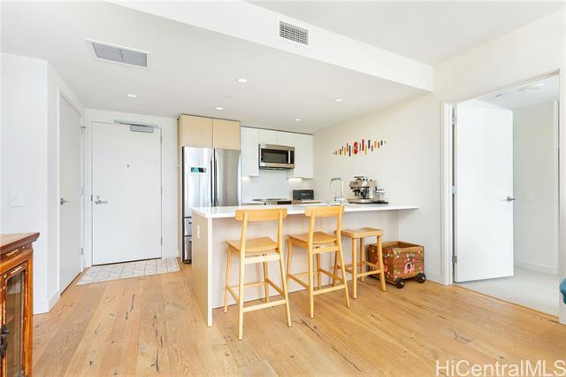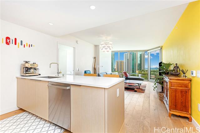 Experience the urban luxury at Ae'o in the vibrant Ward Village! This stunning 2-bedroom, 2-bathroom unit showcases ocean and city views, two parking stalls (tandem), and a dedicated storage locker-perfectly positioned in front of your EV charger for ultimate convenience. Step inside to a thoughtfully designed layout with bedrooms on opposite sides of the living area for maximum privacy. The primary suite features an enclosed walk-in closet, while the gourmet kitchen is a chef's dream with sleek quartz countertops and top of the line Bosch appliances. Live where everything is at your fingertips-enjoy direct access to Whole Foods Market, and walk to Ala Moana Beach Park, world class shopping, dining, and entertainment. Ae'o resort style amenities include: Sky Terrace, two pools, sauna, private screen theater, fitness center, dog park, BBQ cabana, playground, and guest suites. VA Assumable Loan Available with 2.25% interest rate.