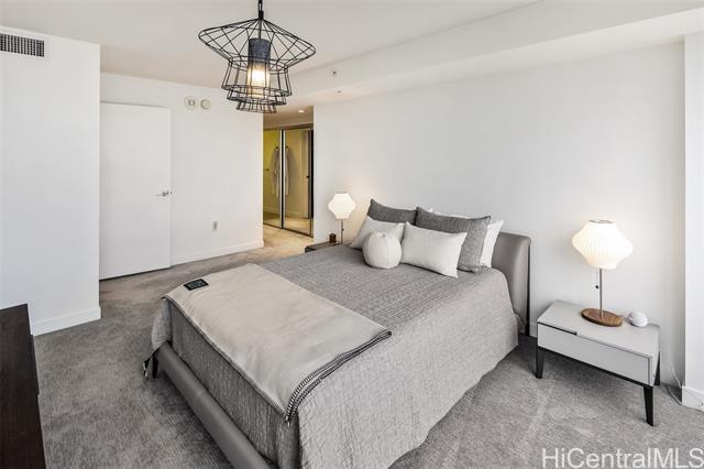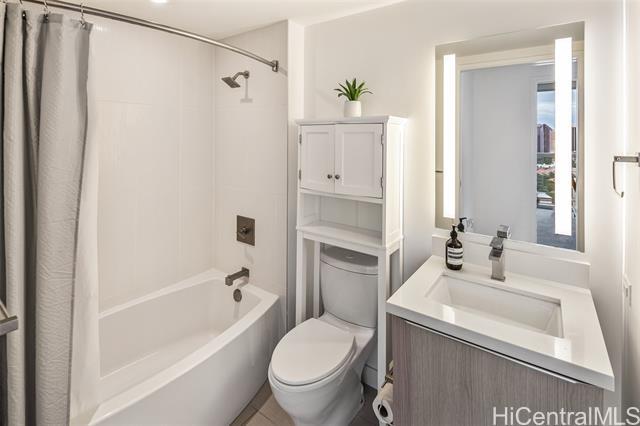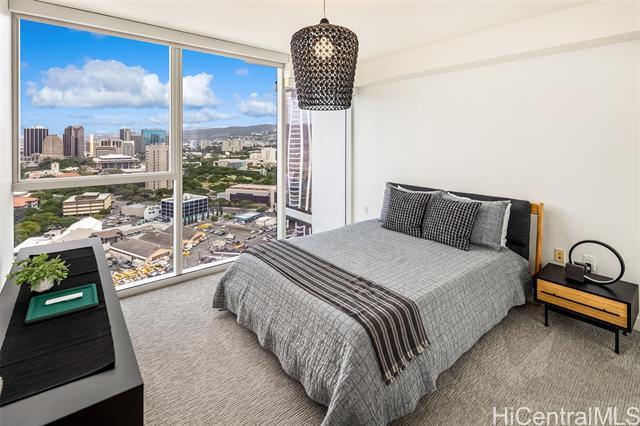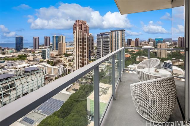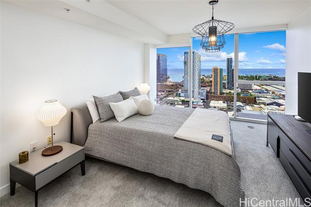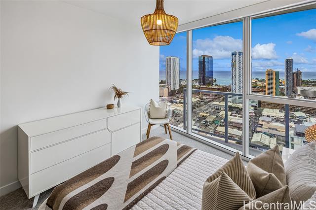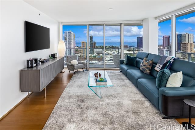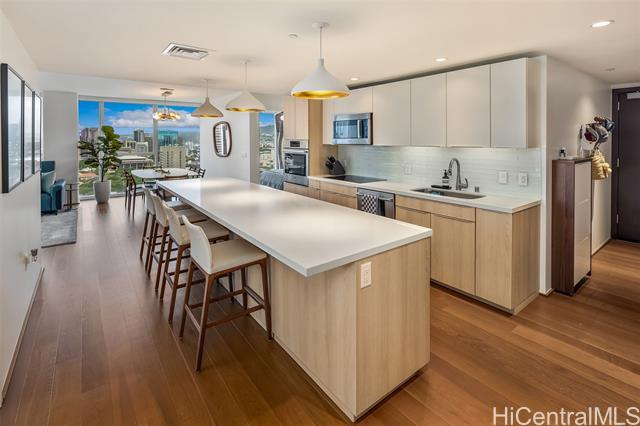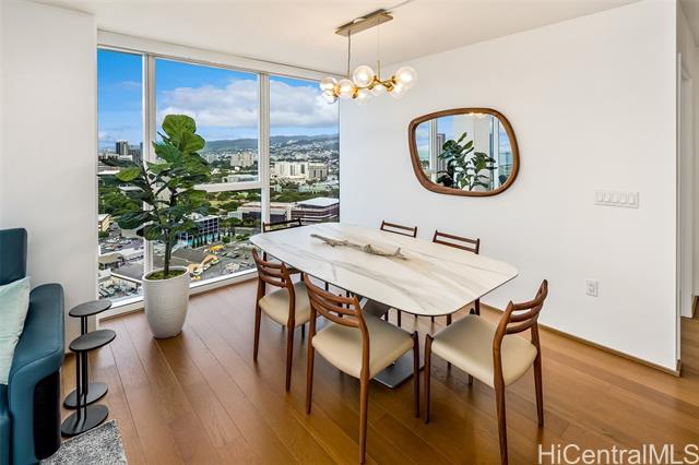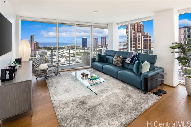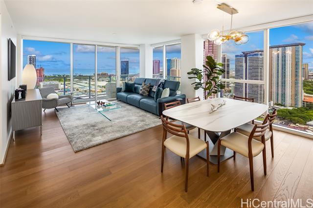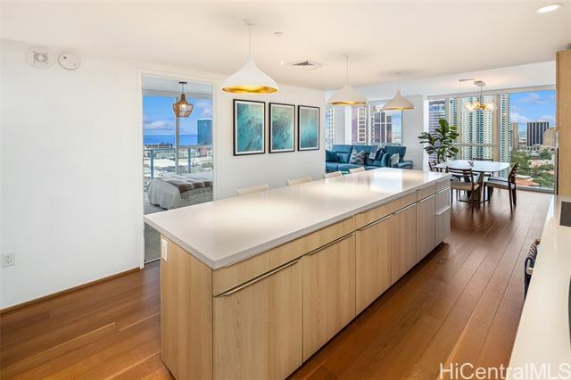 High-floor 3-bedroom condo in Kakaako with ocean, city and mountain views. This unit is move in ready and thoughtfully laid out for everyday living. From the moment you enter, the unit offers ocean views and with floor to ceiling windows that bring in steady, natural light, all throughout the day. The floor plan is practical and livable, featuring a separate laundry room, an open kitchen with a large island, and a living area that comfortably accommodates both relaxing and entertaining. The lanai seats 2+ and the sunsets from here are incredible. The kitchen features Studio Becker cabinetry, soft-close drawers, Bosch stainless steel appliances and a quartz countertop for the island. A great gathering place in this home is indeed the kitchen. Engineered hardwood flooring runs throughout the main living area and has been well maintained. Each room is equipped with motorized shades for heat and light control. The primary suite is spacious with incredible ocean views, walk in closet and a dual vanity. The unit comes with 2 side by side parking stalls. Pets are allowed. Building is centrally located to all the conveniences of a modern city like Honolulu is. Come see today!